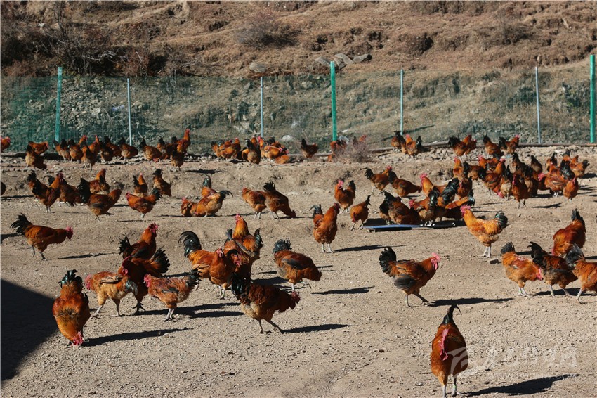 雄雞啼鳴鬧山谷,灣地溝村喜脫貧。129日上午10時許,當記者沿著通村水泥路來到距雅江縣城20多公里的呷拉鎮(zhèn)灣地溝村紅標雞生態(tài)養(yǎng)殖基地時,只見冬日暖陽下的洼谷山半山坡上,成群結(jié)隊的大紅公雞正在樹林下或覓食或展翅或歡歌。飼養(yǎng)員告訴記者:“別小看這3000多只活潑可愛的跑山雞,那可是村民心中的‘財富金雞’!”