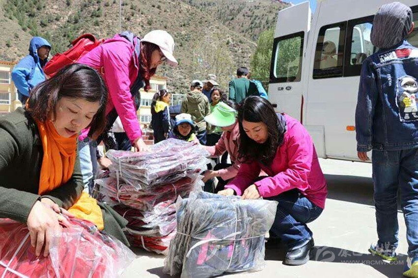 援藏隊員分發(fā)助學(xué)物資。