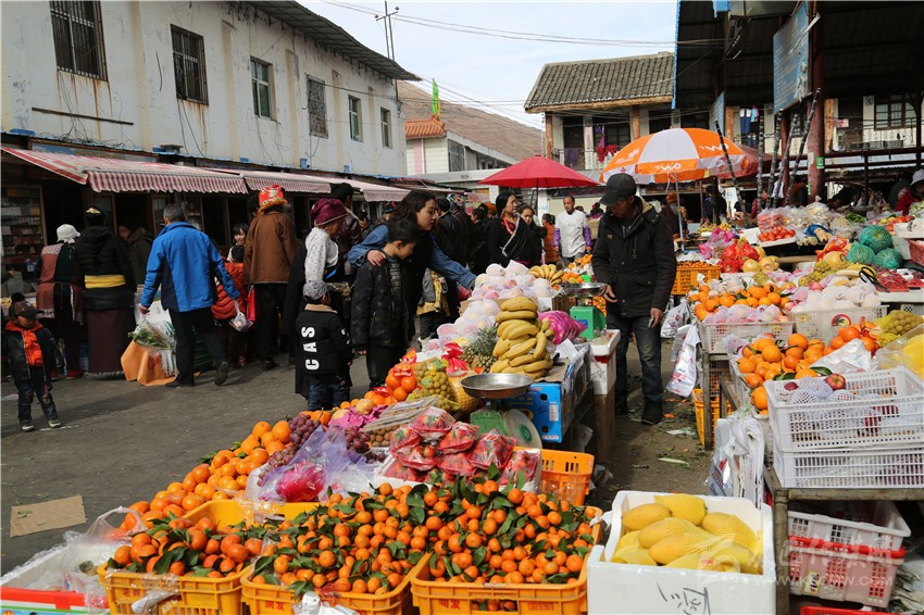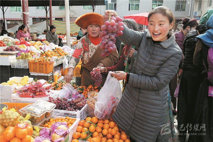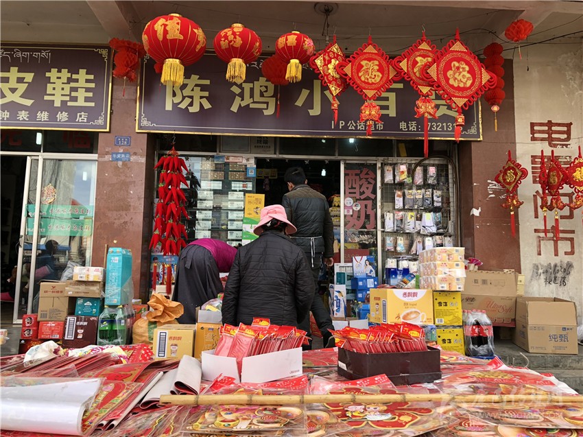 新都鎮(zhèn)格色村的丹真大哥和老伴兒其吉牽著8歲的孫子正在干果店里挑選各類(lèi)干果,身后的背簍里水果、蔬菜、酥油、牛肉等農(nóng)畜產(chǎn)品以及中國(guó)結(jié)、年畫(huà)、對(duì)聯(lián)、掛圖等吉祥的節(jié)日物品應(yīng)有盡有。