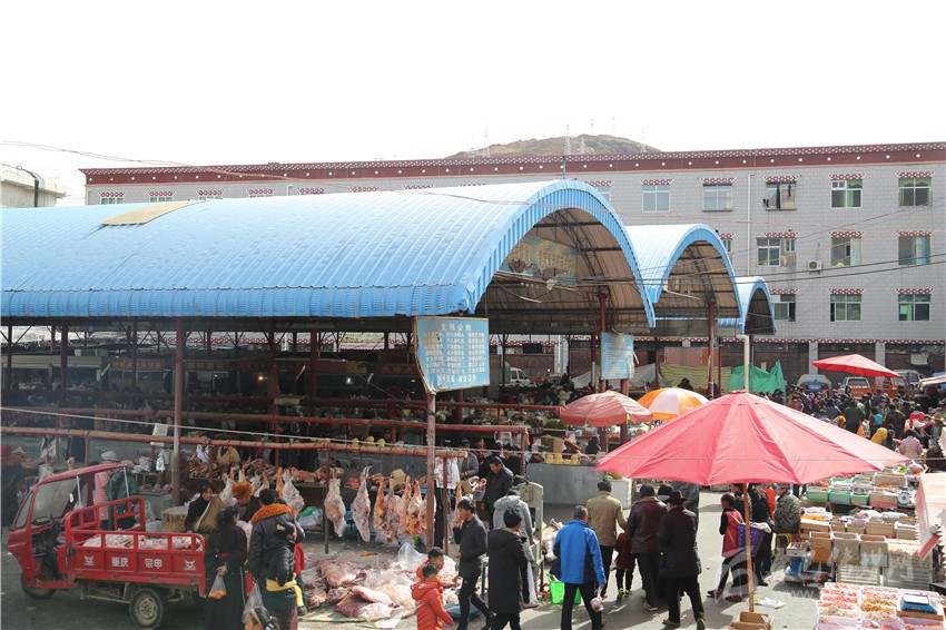 走進(jìn)康北農(nóng)貿(mào)市場(chǎng),筆者看到,一捆捆新鮮的綠色蔬菜、一塊塊剛剛宰好的牦牛肉、一箱箱水果整齊地?cái)[放在臺(tái)案上吸引著過(guò)往農(nóng)牧民群眾的眼球。不大的市場(chǎng)里熱鬧非凡,大家有人正忙著選購(gòu)牛肉、水果和糖等年貨,有人正把一箱箱包裝好的年貨往車(chē)上搬運(yùn)。