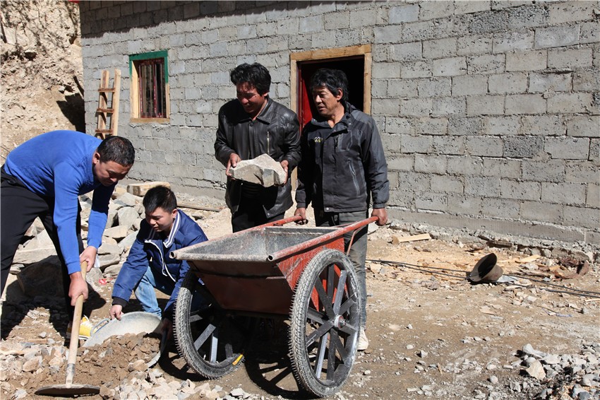 俗話(huà)說(shuō),一方水土養(yǎng)一方人,當(dāng)一方水土不能養(yǎng)活一方人時(shí),移民搬遷就成了最好選擇。這個(gè)行動(dòng)遲緩的中年男子名叫洛絨,今年48歲。他眼前的這幢建筑面積100平方米的磚混結(jié)構(gòu)單層房子,盡管室內(nèi)地面還沒(méi)灌注水泥,房?jī)?nèi)還沒(méi)裝修,但他對(duì)即將入住新房的那份喜悅一覽無(wú)余:“你看,這房子的前面是河、后面是山,太陽(yáng)一出來(lái)就能照著,住起來(lái)肯定舒服;這三間房子就有四個(gè)大窗戶(hù),光線(xiàn)照得進(jìn)來(lái),里面肯定亮堂;這一進(jìn)門(mén)就是客廳,兩邊各有一套大大的房間,裝修好后只要把家具家電一擺上,肯定漂亮;……”正當(dāng)他說(shuō)得津津有味時(shí),鄉(xiāng)上負(fù)責(zé)易地扶貧搬遷干部馬煜和包村干部鄭剛突然出現(xiàn)了他的眼前,他滿(mǎn)是感激地說(shuō):“其實(shí),我知道你們都很忙,用不著隔三差五過(guò)來(lái)幫我,我保證十天之內(nèi)就把地面填平。況且再過(guò)幾天,我愛(ài)人就從山上挖蟲(chóng)草回來(lái)了。有她打下手,兩個(gè)月內(nèi)我們一家人肯定就能住進(jìn)新房子啦!”
