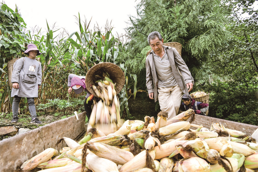 玉米喜獲豐收, 村民笑開(kāi)顏。