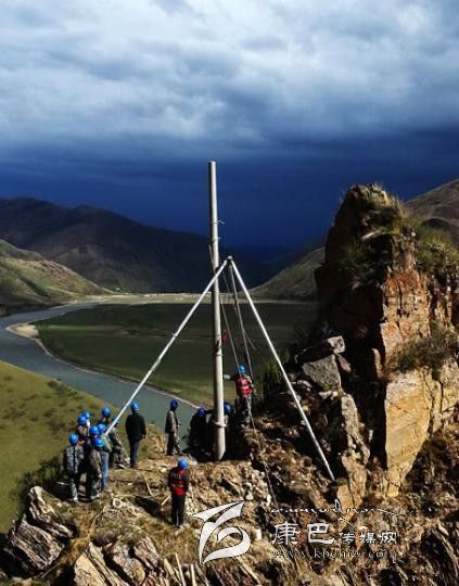 電力施工人員在石渠境內(nèi)的長須干瑪峭壁上艱難立桿。 陳紅梅 攝
