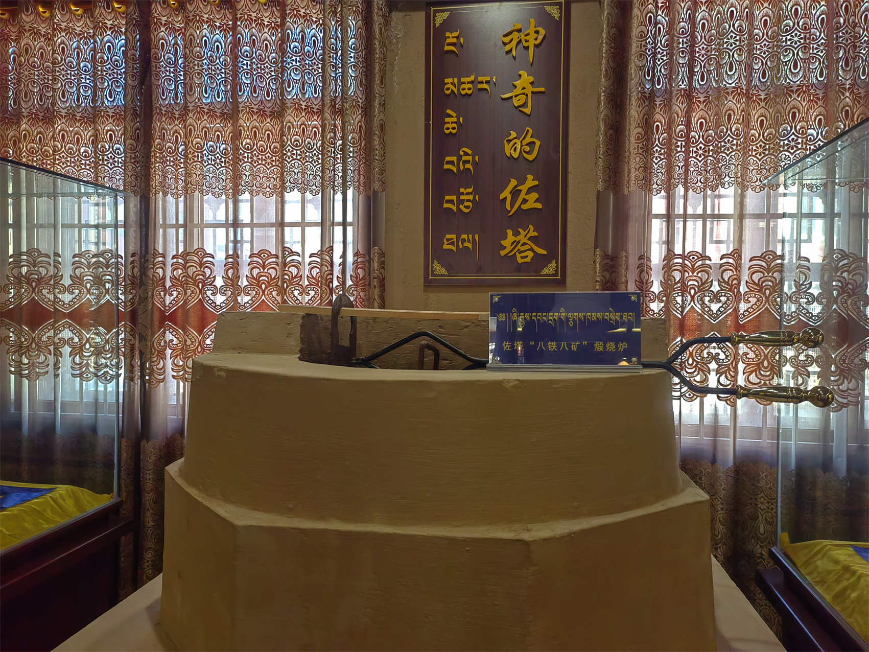 “這里是配制佐塔技藝的展示區(qū),中間黑色的粉末是已做好的成品,而周邊的‘八鐵八礦’就是做佐塔所需要的成分。整個(gè)炮制過(guò)程需要40余天、20多道工序,而且是24小時(shí)輪流換班,才能達(dá)到最佳”……德格縣藏醫(yī)院(藏醫(yī)藥研究所)講解員珠措邊走邊說(shuō)。