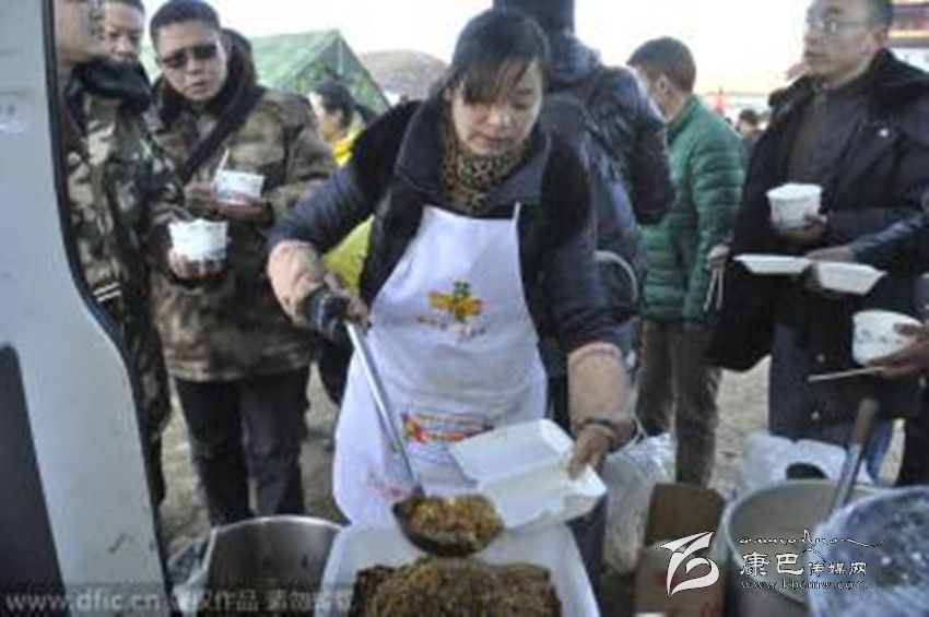 據(jù)了解,韓大哥是這家飯店的老板之一,他是仁壽縣人,幾年前和朋友來到新都橋開始經(jīng)營飯店??刀?.3級地震發(fā)生時(shí),他人在成都。但看到災(zāi)情發(fā)生,韓大哥立即和飯店另外幾個(gè)合伙人決定到安置點(diǎn)免費(fèi)送盒飯,“我在當(dāng)?shù)刈隽?、7年生意,現(xiàn)在出了事情,就應(yīng)該伸手支援嘛!”據(jù)韓大哥介紹,此次地震發(fā)生后,新都橋80%左右的飯店都已經(jīng)關(guān)門,他們的飯店因?yàn)檫€有一些接待工作,仍在正常營業(yè)。自11月23日晚上,他家的飯店就主動為塔公鎮(zhèn)的安置點(diǎn)免費(fèi)派送盒飯,“包括中午和晚上兩頓,兩葷兩素一湯的配置。”因?yàn)樘Γ №n大哥來不及仔細(xì)統(tǒng)計(jì),他大概知道每天送出的盒飯?jiān)?200盒到1500盒之間,每天送出盒飯的成本在4、5千左右。但在他看來,這些其實(shí)都算不上什么,“能為災(zāi)區(qū)出一份力,我們就很滿足了,我們打算一直送到抗震救災(zāi)工作結(jié)束,也就是直到災(zāi)民有條件自己做飯的時(shí)候。”“這邊天氣很冷,他們吃的一般是些面包、牛奶之類的干糧,我們就是想讓大家吃到熱飯、熱菜。”據(jù)韓大哥介紹,每天飯店都會派出3、4個(gè)人將盒飯運(yùn)送到安置點(diǎn),“只要有人需要我們都會分發(fā)盒飯,包括一些志愿者和武警官兵也吃我們的飯。