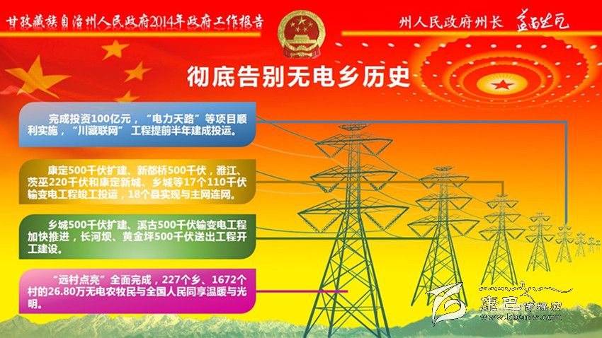 大力推進電力通信建設(shè)。投入20億元,加快實施“電力天路”、無電地區(qū)電力建設(shè)新增項目和農(nóng)網(wǎng)改造升級工程,切實緩解邊遠(yuǎn)地區(qū)群眾缺電問題;完成長河壩電站500千伏等3個輸變電項目;統(tǒng)籌抓好表后入戶工程,確保群眾安全用電。投入6億元,新建通信光纜2360公里、基站1025個,解決國省干道、旅游景區(qū)景點信號盲區(qū);新增30個自然村通電話、545個行政村通寬帶,出口總帶寬達到82G。