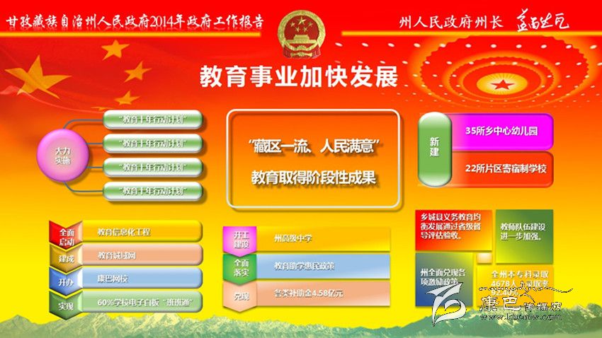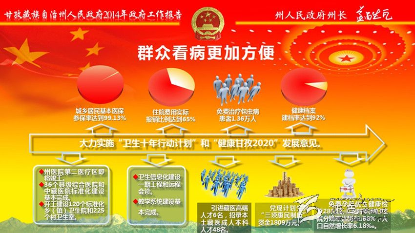 加大民生投入,全年民生支出139億元。全州城鎮(zhèn)新增就業(yè)7400人,城鄉(xiāng)低保實現(xiàn)應(yīng)保盡保;在全省民族地區(qū)率先實施醫(yī)療保險制度城鄉(xiāng)統(tǒng)籌,異地就醫(yī)即時結(jié)算全面啟動;在全省率先出臺大病醫(yī)療保險規(guī)定。教育事業(yè)加快發(fā)展。新建35所鄉(xiāng)中心幼兒園、22所片區(qū)寄宿制學(xué)校,州高級中學(xué)開工建設(shè)。全面落實教育助學(xué)惠民政策,兌現(xiàn)各類補助金4.58億元。城鄉(xiāng)居民基本醫(yī)保參保率達到99.13%,健康檔案建檔率達到92%;開工建設(shè)120個標(biāo)準(zhǔn)化鄉(xiāng)(鎮(zhèn))衛(wèi)生院和225個村衛(wèi)生室;衛(wèi)生信息化建設(shè)一期工程和遠(yuǎn)程會診、教學(xué)系統(tǒng)建設(shè)基本完成;兌現(xiàn)計劃生育“三項惠民制度”資金1809萬元。群眾文化生活日益豐富。建成縣“兩館”12個;開工建設(shè)州民族體育館、州農(nóng)牧民演藝培訓(xùn)中心和14個縣級全民健身中心,建成農(nóng)民體育健身工程739個;開展 “送文化下鄉(xiāng)”近千場;康巴文化研究院“四大工程”全面啟動。深入實施“百千萬康巴英才工程”,人才科技工作扎實有效。扶貧移民工作成效明顯。完成1360個貧困村、19.91萬扶貧對象立卡建檔工作;實施整村推進63個、連片開發(fā)項目4個、彝家新寨(村)17個、索改橋23座,易地扶貧搬遷9850人,2.65萬群眾生產(chǎn)生活條件得到改善。
