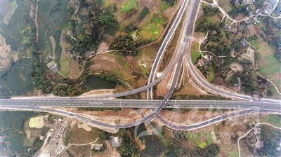 上午11時(shí)許,當(dāng)記者驅(qū)車到達(dá)對(duì)巖樞紐互通立交,用無人機(jī)從空中俯拍,這個(gè)縱橫交錯(cuò)、恢弘磅礴的交通樞紐,宛如盤旋在云端的銀龍,又似在大地上延伸的血脈,其造型、規(guī)模、結(jié)構(gòu)都令人嘆為觀止。
