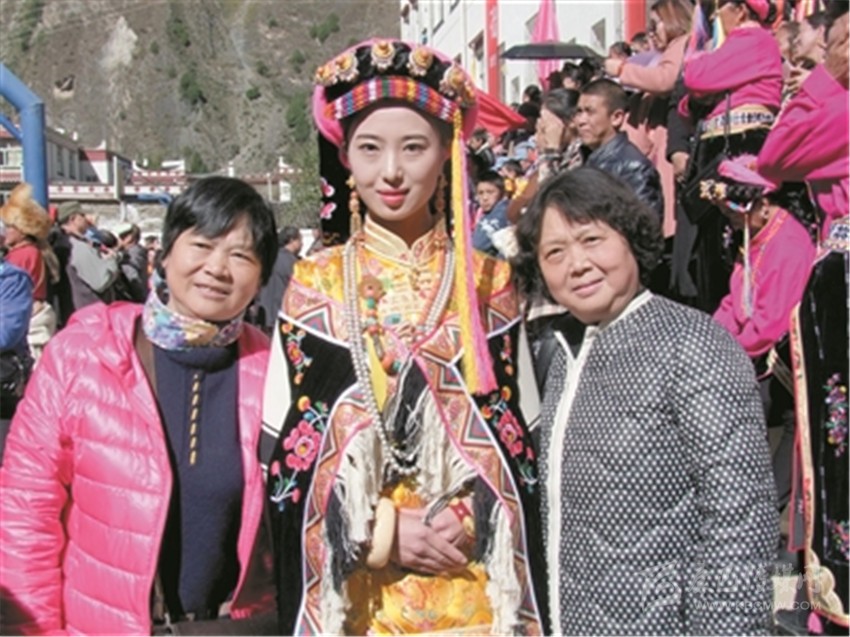 游客與丹巴美女合影。本報(bào)記者 蘭色拉姆 攝