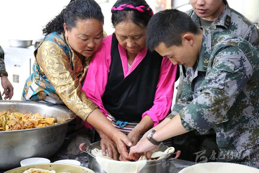巴塘群眾與部隊官兵共同制作“團結包子”。
