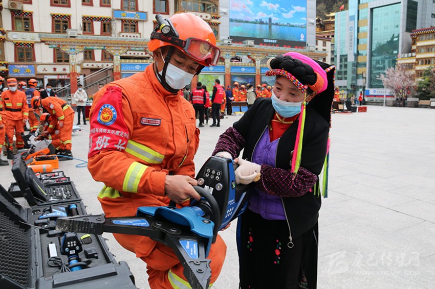 州森林消防支隊(duì)隊(duì)員向市民展示救援工具。