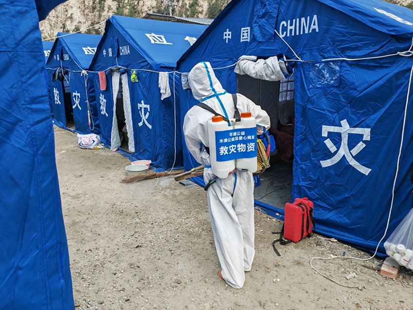 藏醫(yī)院醫(yī)務(wù)人員在地震災(zāi)區(qū)進行消殺。