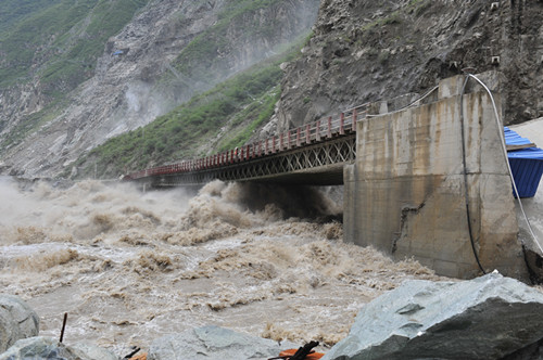 6月29日,恰逢周末,但在該公司的防汛指揮中心已是繁忙緊張氣氛,防汛值班員雖已熬紅了雙眼,緊盯著監(jiān)視屏并時刻保持與前方的聯(lián)系;7時23分,該公司副總經(jīng)理杜三林,長河壩工程部、安全環(huán)保部相關負責人來到了指揮中心;8時,流量逼近4170立方米每秒;10時,流量超過4200立方米每秒,已超過該工程自2010年開工以來最大流量,整個指揮中心的氣氛變得隨之凝重起來;10時30分至11時,指揮中心接連收到施工單位電話險情報告:此時此刻,長河壩工程初期導流洞水勢兇猛,導流洞出口橋0號橋臺回填料淘刷嚴重,1號橋墩發(fā)生傾斜,橋梁隨時有傾覆的可能,將會危及下游圍堰高程最低的中水十四局、中水五局營地的安全,更將會危及到300余名員工的人身安全;金湯河突發(fā)特大洪水,沖垮了通往金湯土料場的場內(nèi)公路,沿線山體已發(fā)生了小型泥石流,土料場通訊、交通已全部中斷,急需救援;持續(xù)降雨引發(fā)響水溝泥石流,3萬余立方米泥石流堆積物順溝而下,沖垮了響水溝石料場的鋼橋,并堵塞了場內(nèi)12號路1號隧道。必須馬上清運疏通,否則,響水溝再發(fā)泥石流,長河壩上游圍堰和大壩填筑工作面將直接面臨泥石流堆積物的直接沖擊,險情萬分緊急!