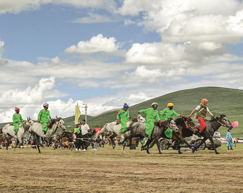 賽馬是藏族群眾娛樂生活的主要內(nèi)容,是極具特色的民俗活動,是藏族群眾對力量、勇敢、智慧的向往和崇拜,也是一項充滿激情的傳統(tǒng)民族體育運動。近年來,色達縣利用“金馬節(jié)”這一傳統(tǒng)民族節(jié)日,開展了長跑、短跑和走馬等賽馬比賽,在遼闊的扎青塘草原中央,騎手們與賽馬緊密配合,英姿颯爽,風采盡顯,卓越的表現(xiàn)引得場外加油聲、喝彩聲此起彼伏,群馬奔騰的景象震撼人心,讓前來觀賽的群眾大飽眼福,嘆為觀止。