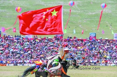 7月25日,第八屆康巴文化藝術(shù)節(jié)在玉樹藏族自治州開幕。數(shù)名參加開幕式的藏族老鄉(xiāng)高舉鮮艷的五星紅旗策馬狂奔,風(fēng)馳電掣,跨越扎西科賽馬場,一瞬間,歡呼聲震耳欲聾,開幕式進(jìn)入高潮。