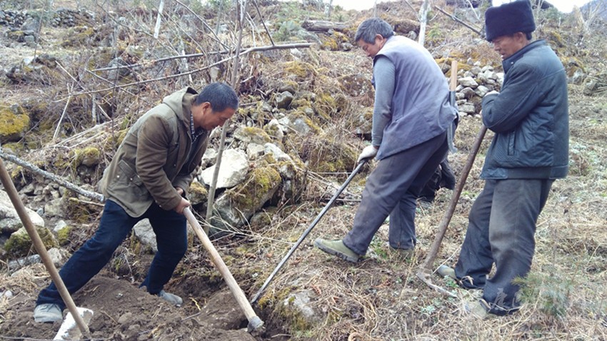 陳朝貴(左一)帶頭為貧困群眾整治土地。