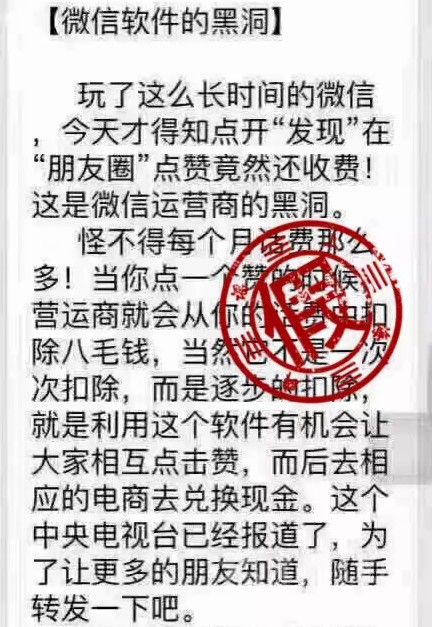 事實(shí)上,這是一條傳播已久的老謠言。此前,“@騰訊用戶(hù)服務(wù)”官方微博回應(yīng)稱(chēng)傳聞純屬謠言:“朋友圈點(diǎn)贊要扣話費(fèi)。怎么可能!免費(fèi)好不好!朋友圈要的就是小伙伴們的情感互動(dòng),情誼無(wú)價(jià)!”中國(guó)聯(lián)通的工作人員也介紹,運(yùn)營(yíng)商的每一項(xiàng)常規(guī)收費(fèi),都會(huì)按照雙向通知的原則,即提示客戶(hù)所使用的某項(xiàng)業(yè)務(wù)會(huì)收費(fèi),待客戶(hù)確認(rèn)了解并同意后才能收費(fèi),所以微信點(diǎn)贊會(huì)被扣話費(fèi)是謠言。記者了解到,“點(diǎn)贊扣話費(fèi)“屬于“微信X月X日即將收費(fèi)”這類(lèi)謠言的衍生版本。比如,近期網(wǎng)上也出現(xiàn)了“騰訊宣布8月1號(hào)微信所有功能將全部收費(fèi)”的信息。昨天,微信團(tuán)隊(duì)發(fā)表聲明也對(duì)此進(jìn)行了辟謠,稱(chēng)該說(shuō)法嚴(yán)重失實(shí)