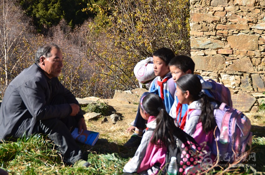雖然代課教師的工資從當(dāng)年的每月200元漲到了現(xiàn)在每月800元,然而在以市場(chǎng)經(jīng)濟(jì)為主體的社會(huì)里,800元工資的人群屬于低收入群體。盡管如此,阿布里老師依然早出晚歸,在那條他閉上眼都能走的小徑上來(lái)回奔波,依舊嘔心瀝血教書(shū)育人,那郎朗的讀書(shū)聲在藏寨的上空久久回蕩。每天上學(xué)放學(xué)路上,孩童們?cè)诎⒉祭锢蠋煹膸ьI(lǐng)下,在小徑上排著整齊的隊(duì)伍,撒下一路歌聲一路歡笑。