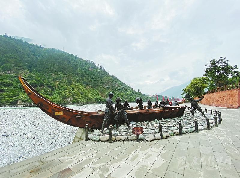 不遠(yuǎn)處的安順場渡口、大渡河邊,矗立著一座“紅軍渡”石碑,上面的三個鮮紅大字由渡河時任第一軍團(tuán)第一師一團(tuán)團(tuán)長楊得志題寫。石碑旁陳列著的一艘長10.5米、寬2.3米、高2.2米的“紅軍船”,正是當(dāng)年紅軍強(qiáng)渡大渡河時使用的翹首木船復(fù)制品。木船旁,是戰(zhàn)士和當(dāng)?shù)卮兿蚰敬\(yùn)送武器裝備的雕像,斜坡上,勇士隊伍正奔向渡口。