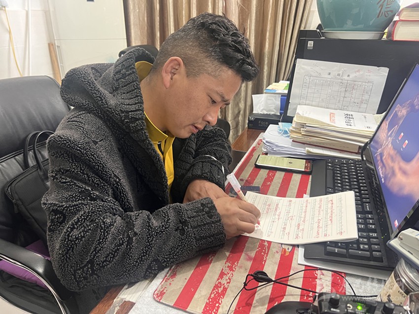 “尼瑪老師不僅對(duì)學(xué)生的學(xué)習(xí)生活關(guān)懷備至,作為任課教師,我們常??吹剿谛菹r(shí)間認(rèn)真?zhèn)湔n。他會(huì)聲情并茂地大聲誦讀精心準(zhǔn)備的課件,大家都覺得很有趣,學(xué)生學(xué)習(xí)的積極性也提高了。他批改作業(yè)也非常認(rèn)真,給每一位同學(xué)寫的評(píng)語都用心用情。他是真的是用全部身心來對(duì)待工作,不愧是一名優(yōu)秀的老師?!辈稍L過程中,筆者偶遇了援建教師廖俊希,談起對(duì)章拉尼瑪?shù)挠∠?,廖俊希的評(píng)價(jià)細(xì)致而中肯。