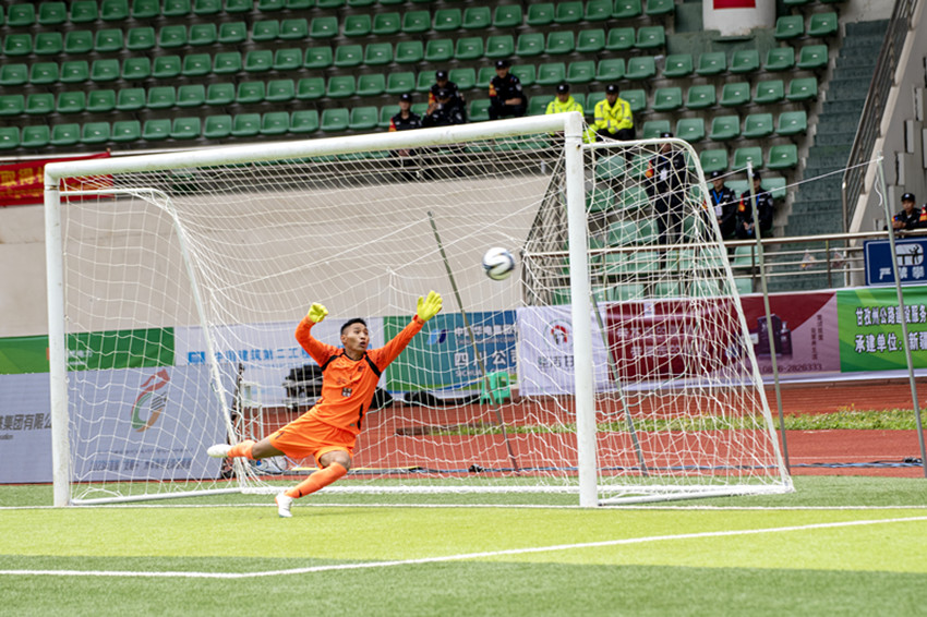 隨著主裁判吹哨發(fā)令,身穿白色球衣的甘南隊(duì)及藍(lán)色球衣的昌都隊(duì)球員各赴站位,迅速進(jìn)入狀態(tài)。上半場(chǎng),甘南隊(duì)積極拼搶、快速進(jìn)攻、精準(zhǔn)傳球,很快主導(dǎo)場(chǎng)上局勢(shì)。而昌都隊(duì)雖后防穩(wěn)健,進(jìn)攻則顯得略為保守。第9分鐘,甘南隊(duì)員在大禁區(qū)前沿帶球晃過(guò)昌都隊(duì)員后,雙方爭(zhēng)奪激烈,甘南隊(duì)員倒地,裁判鳴哨,甘南隊(duì)獲得前場(chǎng)任意球機(jī)會(huì)。在此前比賽中已打入2球的33號(hào)球員索南道吉站上罰球點(diǎn),短暫調(diào)整后打出一記弧線球,昌都隊(duì)門將撲救不及,足球應(yīng)聲入網(wǎng),甘南隊(duì)取得1:0領(lǐng)先。