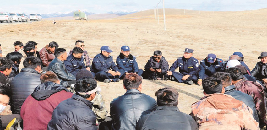 稍作休整,為了讓蟲草采集群眾和隨行的數(shù)十臺各型車輛安全到達魯然蟲草山,派出所民輔警和鄉(xiāng)鎮(zhèn)工作人員組織群眾席地而坐召開壩壩會,核查入山證,講明道路交通安全、森林草原防火知識,提醒群眾遵紀守法、文明進山。