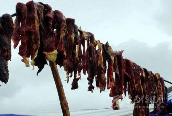 藏族同胞喜歡吃風(fēng)干的牛羊肉。風(fēng)干肉一般在冬天的十一月底制作。這時(shí)候的氣溫都比較低,在零度以下,把牛、羊肉割下來(lái),掛在陰涼的地方,讓其風(fēng)干,去出水份。藏民把牛、羊肉割成小塊串上,或用竹籠掛在帳房、屋檐下的陰涼處,第二年的三月之后,將早已風(fēng)干的肉取來(lái)烤食或者直接生食,咀嚼時(shí)無(wú)渣塞牙。在高寒地區(qū),食品不易霉?fàn)€變質(zhì),去水又保鮮,故時(shí)至今日,吃風(fēng)干牛肉之風(fēng)仍盛行。