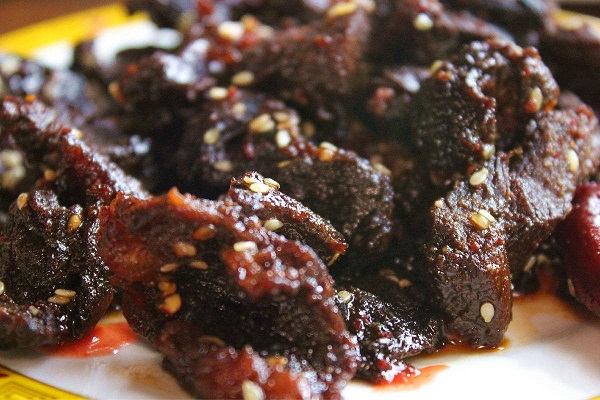 3500米以上地區(qū)這些地方生長著許多野生藥種如貝母,蟲草等,耗牛常食這些藥材,其肉鮮美無比,殺后可炒紅燒,清燉或涼曬成干巴等,其味獨特,吃耗牛肉在迪慶,實在是一種享受。并可在市場購買干巴,肉松等作饋贈青朋好友的禮品。牦牛肉可以粘辣椒油,味道仍然鮮美??刀ǖ呐H獠粌H有牦牛肉,還有熏牛肉等等,比起其他康定特產(chǎn)更是別具一番風味。