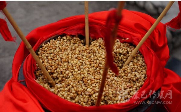 嘉絨語稱“恰鹵”。咂酒是青稞釀制而成的。首先取一定數(shù)量的青稞粒,一般5斤、8斤或10斤,在大鐵鍋中用水煮成八成熟后,放在簸箕里晾開,待冷卻后放上一定比例的酒曲,合勻,又裝入大鐵鍋中發(fā)酵三至四天,待聞到酒香味后,裝入壇中并加水,放置一天以上后,即可取汁食用,這個汁就是咂酒。咂酒味甘甜淳厚,十 分爽口,看似不醉人,但有的甘甜之中略帶苦澀,說明酒勁足,不勝酒力者應少飲為宜。曾有人寫《飲咂酒詩》說:“成石雜糧一甕收,王侯到此也低頭,五龍抱住 撐天柱,咂盡黃河水倒流”。充分展示了咂酒的魅力和飲咂酒的那種愜意。境內(nèi)巴底、半扇門的上半鄉(xiāng)、太平橋鄉(xiāng)一帶的群眾喜愛煮咂酒,平日,家家都備有咂酒,親朋間禮尚往來、人情世故都送咂酒。喝咂酒是當?shù)氐囊淮罅曀??!墩鹿韧椭?略)》記載了清朝后期宅壟土屯區(qū)的飲食習俗時說:“夷人(封建統(tǒng)治者對藏族的貶 稱)寨中置巨甕或木桶,富者大銅瓶盛酒,于內(nèi)植竹竿十余枝,跌坐于地互相吸飲,不杯杓勸酧(酬),無餚核(指熟食的魚肉干果),惟各布豬膘、牛肉、‘得木 鳥’(火燒子饃饃),醉飽而散”?,F(xiàn)在,巴底鄉(xiāng)、半扇門的上半鄉(xiāng)、太平橋鄉(xiāng)的大多數(shù)村寨仍然保留著這些習俗。在節(jié)日或慶典之時,在大壩子中間放一個大的壇子或木桶,里面盛滿含有酒糟的咂酒,然后插入麥桿數(shù)根,眾人圍個大圓圈跳鍋莊,口渴時依次吸之;或一人手持葫蘆,里盛咂酒,在眾人中依次轉(zhuǎn)之;或眾人盤腿 圍坐,傳一壺咂酒,稱喝“轉(zhuǎn)轉(zhuǎn)酒”。