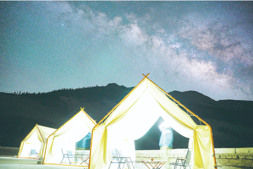 走進觀山悅嶺民宿,古樸的藏房與現(xiàn)代簡約設(shè)計風尚相互交融,三五游人閑庭信步、漫步在厚厚的草甸上,清風徐徐,坐在星空帳篷中,煮茶品茗,靜靜地感受著時光流淌。